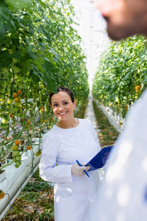 Smiling female scientist with Tatsoi plant in hothouse