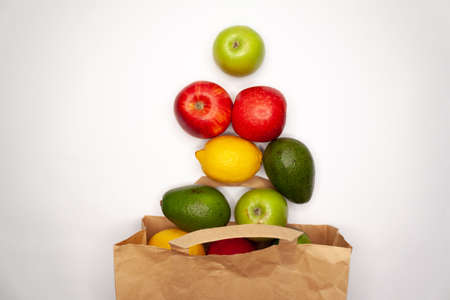 Grocery shopping fruit and vegetables in a brown paper bag, high in lycopene for a healthy heart with immune boosting foods high in antioxidants, anthocyanins, vitamins, and fibre. On mottled yellow.