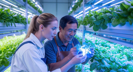 Two agricultural scientists inspecting a glowing plant in a modern vertical farm with LED lights. focus on sustainable food production and innovative technology.