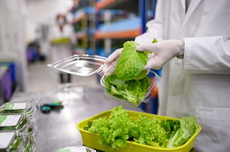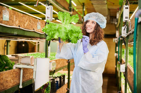 2 Scientists examined the quality of vegetable organic salad and lettuce from the farmer's hydroponic farm.