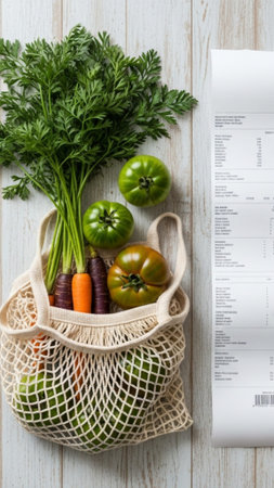 Showing reusable burlap bag overflowing with baguette, bell pepper and greens, with market graphs. Eco-friendly, sustainable, organic, market, shopping, data visualization, finance