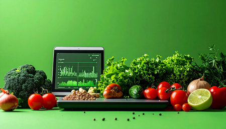In a modern lab, a computer analyzes the nutritional composition of fresh, vibrant vegetables.
