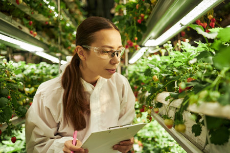Caucasian young woman wearing protective glasses inspecting strawberry plants in indoor vertical farm holding clipboard and pen conducting agricultural research