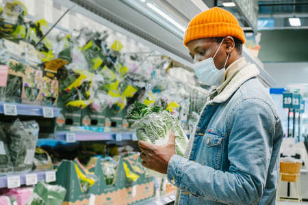 Close-up of black agricultural engineer in gloves holding lettuce leaves and inspecting plant at greenhouse