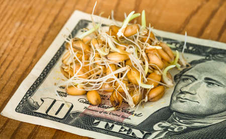 germinating grain environmentally friendly organic wheat lying on the banknote of ten dollars ready for sale as a healthy diet as well as for the energy drinks preparation of malt, beer, close-up