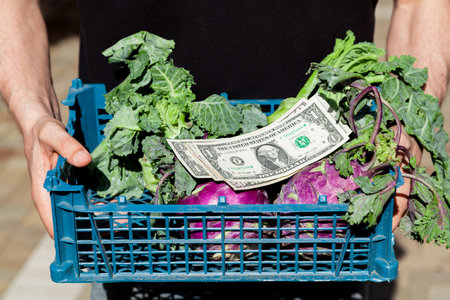 The farmer is holding a plastic box with kohlrabi cabbage in his hands. On top are dollar bills
