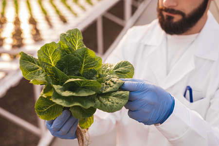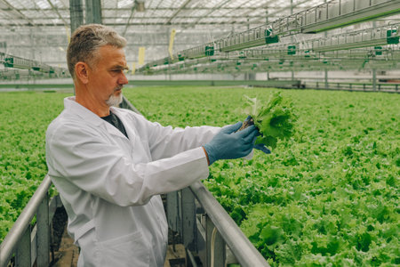 Male agricultural scientist in white lab coat examining fresh green lettuce in a greenhouse, surrounded by rows of plants, showcasing sustainable farming practices, dedication to quality produce