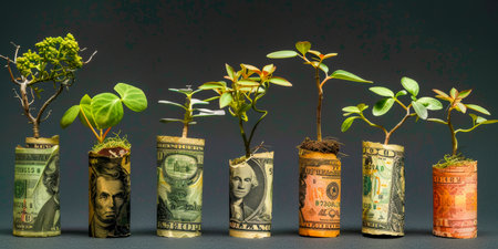 Growing plants beside coins symbolizes the connection between nature and financial growth in a dark setting