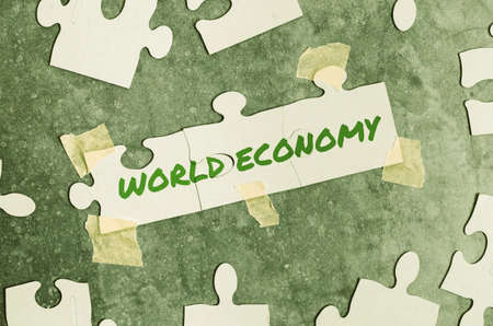 Conceptual display World Economy. Business showcase Global Worldwide International markets trade money exchange Building An Unfinished White Jigsaw Pattern Puzzle With Missing Last Piece
