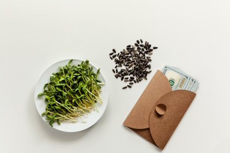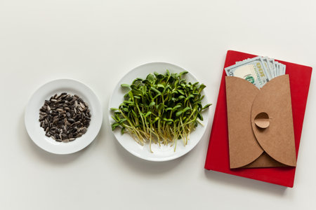 Green sunflower sprouts grown at home, one hundred dollar banknotes on a white background. The concept of earnings, eating healthy, eco product, micro greens.