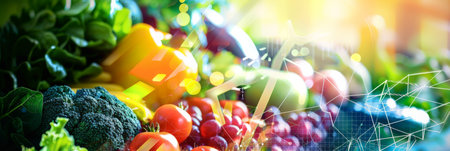 Vibrant vegetable assortment with digital elements on a colorful background. Tech-enhanced healthy eating concept.
