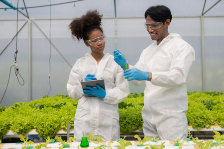 African American researcher and plant genetics expert. Test the quality and bacteria in the hydroponics vegetable garden. Researchers are collecting samples to test vegetables grow