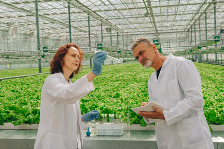 Scientist working in hydroponic greenhouse farm, clean food and food science concept