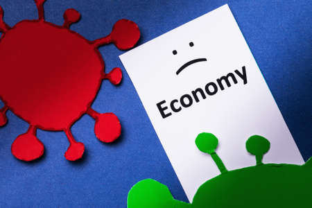 Label with text and paper figurines in the shape of the covid-19 virus. Concept on the theme of the impact on the economy of the coronavirus