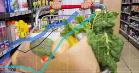 Image of data processing over caucasian woman with trolley in shop. global business, shopping and digital interface concept digitally generated image.