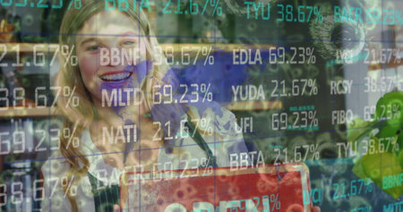 Smiling woman holding Open sign with stock market data overlay. Entrepreneurship, success, finance, business, investment, economy