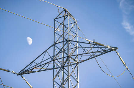 Detail of electricity pylon with the moon against a blue sky, depicting UK National Grid and electricity power supply