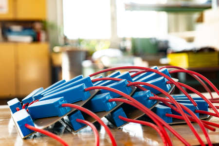 Close-up of a large green microcircuit with red HI-voltage wires and blue relays connected to it at a military equipment factory. The concept of new HI-voltage technologies in production