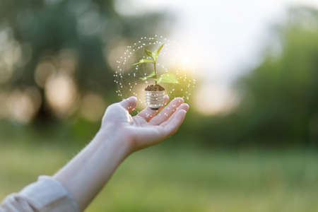 Future showing person holding a growing green plant with glowing blue energy and environmental...