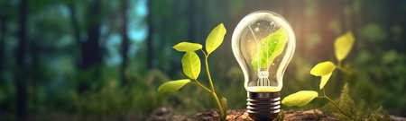 eco light bulb shines in the forest, the leaves inside it symbolize clean and renewable energy, the concept of a clean planet, ultra wide format, by ai generative