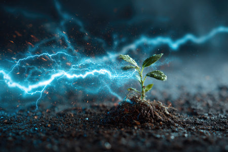 A small plant is shown emerging from dark soil. Intense electric blue lightning bolts illuminate the scene, creating a stark contrast. The composition features an overhead perspective with a shallow depth of field. This image could be used in a variety of projects, including those that deal with nature.