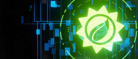 Solar Energy Eco Concept with hand pointing futuristic interface abstract banner background 3D Illustration