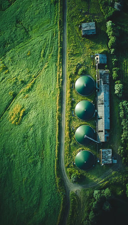Aerial View of a Modern Biogas Plant with Greenery, Promoting Sustainable Energy Solutions Today