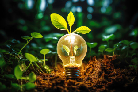 A light bulb with a green plant inside illuminates brightly against a backdrop of lush foliage, symbolizing the promise of clean and renewable energy.