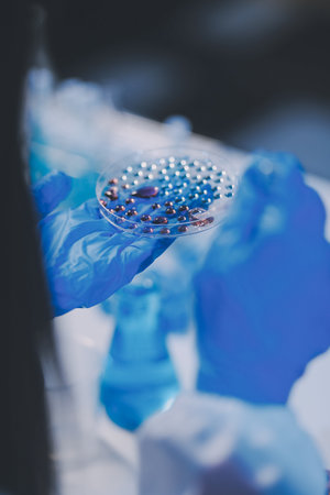 Hand in blue glove holding petri dish with bacterium. Microbiology science. Top view.