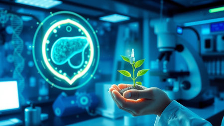 A vivid holographic simulation of genetic transcriptions is displayed beside traditional lab samples in petri dishes illustrating the contrast between ancient and tingedge ods..