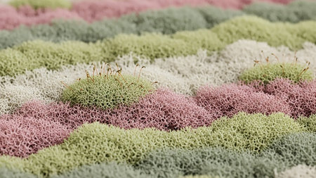 A close-up, detailed view of textured reindeer moss in rows of pastel pink, green, white, and grey, creating a soft, organic pattern.