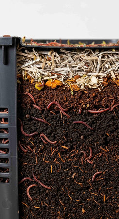 A close up shot of a compost box with earthworms in it