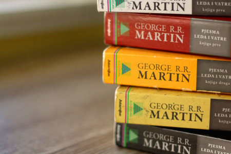 Split, Croatia - April 24, 2021: Stack of popular fantasy books by George R. R. Martin. Selective focus.