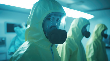 A dedicated lab worker dons a sleek hazmat suit and gas mask, ready to engage in high-stakes research within an advanced scientific facility.