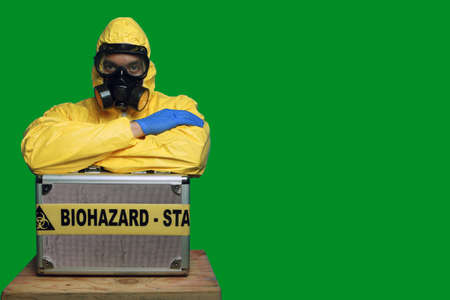 Biological Hazard Worker Safety. Men Wearing Full Face Cover Chemical Mask and Hazmat Suit. Biohazard Symbols Around His Mask.