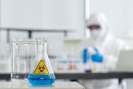 Lab Technician in Personal protective equipment PPE suit Vaccines testing of Virus holding the hazardous lab glass bottle