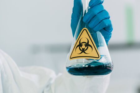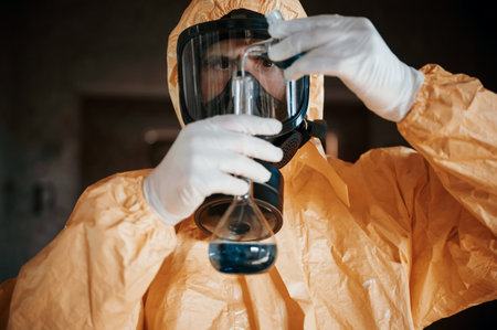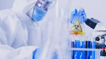 Close-up of a scientist in protective suit with hazardous blue chemical in flask at the laboratory