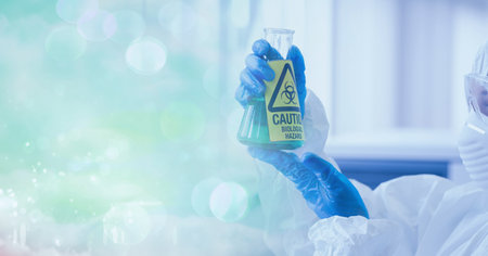 Composition of female scientist in ppe suit holding beaker with biohazard symbol with copy space. science and research concept digitally generated image.