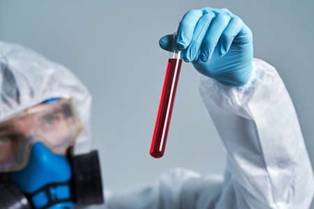 Test tube with virus in hands of scientist in lab, researcher in protective suit and gas mask works with biological weapon. Concept of secret laboratory, military chemical research.