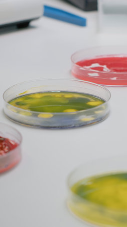 Mixed of bacteria colony in petri dish standing on table in biological scientific hospital laboratory. Pharmaceutical microorganism liquid sample. Liquid medical microorganism