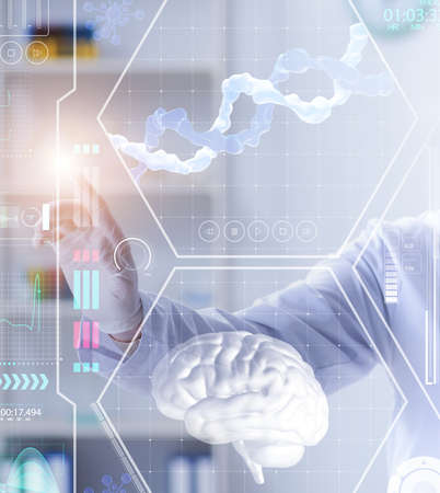 The doctor looks at the brain hologram, checks the test result on the virtual interface, and analyzes the data. Alzheimer's disease, brain dementia, innovative technologies, medicine of the future