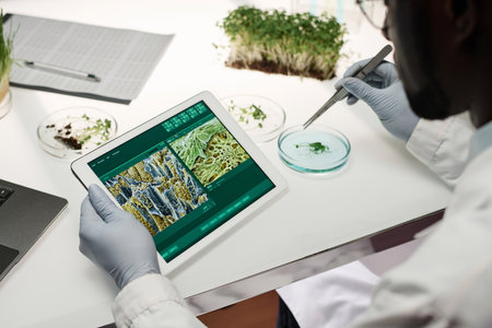 Scientist working at his desk examining image of plant cells on digital tablet screen