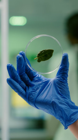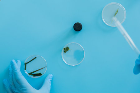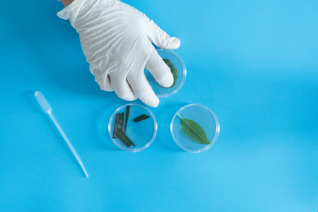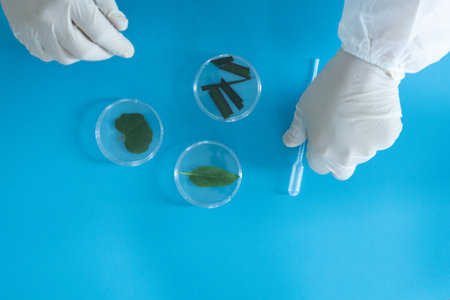 Scientist in blue gloves doing experiment with plant sample in laboratory