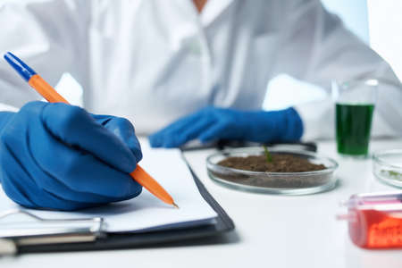 hands in glove working on plants culture in biological laboratory