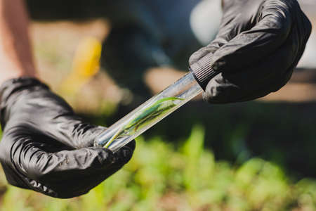 Female scientist examines plant leaves in a test tube with liquid.