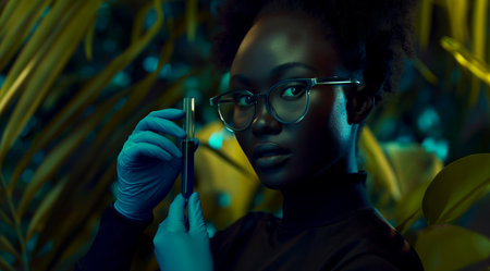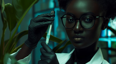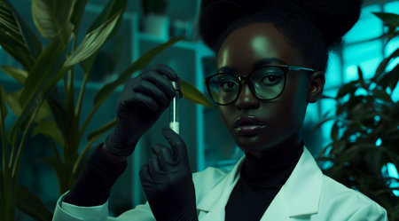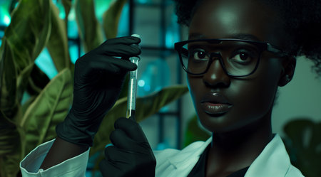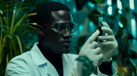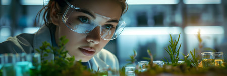 Biotechnology, Science of Genetic Engineering. Scientist experiments with genetically modified plants, laboratory, test tubes, plants obtained by new genomics techniques, mutagenesis. Generative ai.