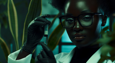 Female scientist working in laboratory with plant samples and test tubes.