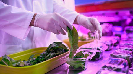 Closeup of botanist researcher holding in hands sample with green leaf researching gmo plant. Botanist researcher working in ecology laboratory analyzing biological expertise