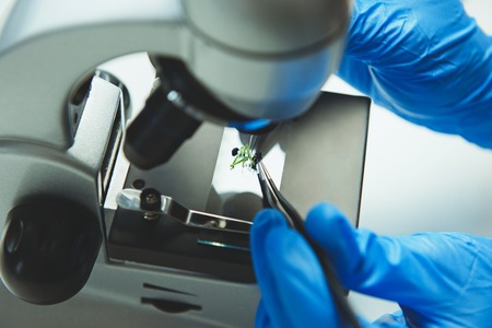 Scientist tests plants with microscope in laboratory. Overhead view
