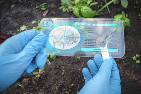 A scientist analysing soil dirt by digital sci fi digital scanner.